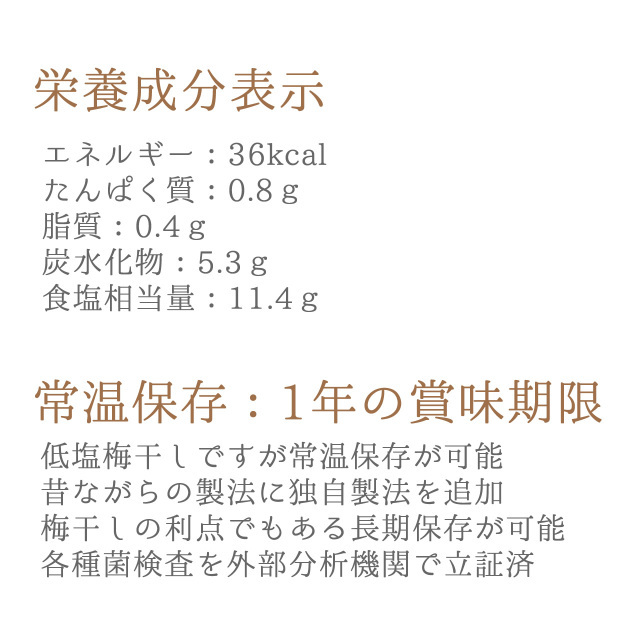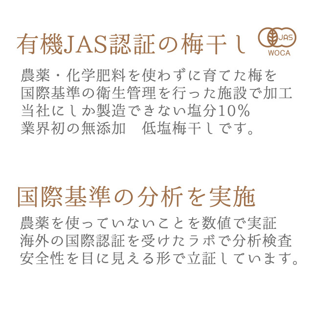 有機栽培では梅の表面を綺麗にするための薬剤などが使用できません、一般栽培の梅と比較すると、どうしても傷や斑点が多くなります。当たり前ですがすべて農作物となり天候や気候に大きく左右されます。同じ品質のものが毎年できるよう努力はしておりますがその年によって品質にバラつきがあることもご理解ください。