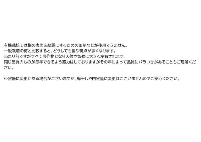 有機栽培では梅の表面を綺麗にするための薬剤などが使用できません、一般栽培の梅と比較すると、どうしても傷や斑点が多くなります。当たり前ですがすべて農作物となり天候や気候に大きく左右されます。同じ品質のものが毎年できるよう努力はしておりますがその年によって品質にバラつきがあることもご理解ください。